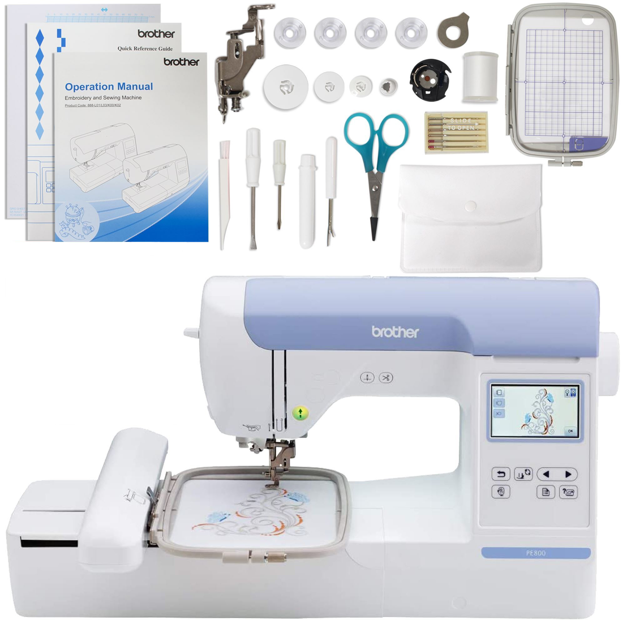 Brother Super PE800 Embroidery Machine No Tax (outside S.C.) Free Shipping Bring your embroidery to the next level! Create dazzling embroidery designs with the Brother PE 800 5” x 7” embroidery field and see them on screen with the large color touch display screen. This Brother PE 800 embroidery package is <strong>designed for multi-color embroidery use</strong> with the optional Large 10 thread stand, you will be able to change colors on the fly, saving time on your projects. Now you can embellish everything from home décor to T-shirts with one of 138 built-in embroidery patterns, including 10 frame designs and 11 built-in fonts. Use the design editing features to customize your project. You can rotate, mirror-image, increase and decrease the size of your designs, and see how your edited design looks, right on the color LCD display, before stitching. The Brother PE800 is easy to use and thread; simply follow the numbered threading diagram printed on the machine. Then, with the automatic needle threader, the thread is pushed right through the eye of the needle. View step-by-step tutorials right on the LCD touchscreen display. Topics include how to thread the machine, how to attach the embroidery arm, and more! This machine is Perfect for home embroiderers looking for a fast, versatile, dedicated embroidery machine they can grow with over time. <strong>Backed by a 25-year limited warranty and free phone support for the life of the product PE800. </strong> <hr /> <div class=""woocommerce-product-details__short-description""> <ul> <li></li> </ul> Support Small businesses and save with zero tax outside S.C. and free shipping. <div> <div class=""section legacy""> <b>Main Features:</b> <ul> <li>199 pre-digitized fonts with editing and customization features</li> <li>800+ embroidery designs</li> <li>Monogram designing, name drops, drawing tools to convert to applique</li> <li>ScanNCut compatible, making applique easy!</li> <li>Word collage feature for word embroidery designs</li> <li>Import FCM files and convert them to Applique</li> </ul> </div> <ul> <li><strong>Specifications</strong></li> </ul> </div> <div> <div class=""section legacy""> <ul> <li>199 pre-digitized fonts with editing & customization features PLUS 800+ embroidery designs!</li> <li>Compatible with ScanNCut DX & Brother Sewing/Embroidery machines.</li> <li>Compatible with PC only</li> </ul> </div> </div> <div> <div class=""section legacy""></div> </div> </div> <hr /> <h3><a href=""https://cfv.clients-demo-website.com/wp-content/uploads/2018/11/BROTHERpe800_front_01.png""><img class=""alignright wp-image-3220"" src=""https://cfv.clients-demo-website.com/wp-content/uploads/2018/11/BROTHERpe800_front_01.png"" alt=""5” x 7” Embroidery Machine with Large Color Touch LCD Screen"" width=""315"" height=""237"" /></a><strong>5” x 7” Embroidery Machine with Large Color Touch LCD Screen</strong></h3> Is ideal for shirt pockets and embellishments on place mats along with applique embroidery. The primary limitation on this embroidery machine is the embroidery field size. You may wish to move up to a larger 6"" x 10"" as seen on the <a href=""https://cfv.clients-demo-website.com/product/brother-nq1700e-embroidery-only-machine/"">Brother NQ1700E Embroidery-only Machine</a>. <h3><strong>Home Sewing & Embroidery</strong></h3> <ul> <li><a href=""https://cfv.clients-demo-website.com/product/brother-sa503-10-spool-thread-stand/"">Often Purchased with this Machine.</a></li> </ul> <strong>Main Features</strong> <ul> <li><b></b>5"" x 7"" embroidery field for larger designs and lettering</li> <li><b></b>Large color touch LCD screen</li> <li><b></b>138 built-in designs</li> <li><b></b>11 font styles</li> <li><b></b>Extensive design editing - Rotate, mirror-image, increase and decrease the size of your designs</li> <li><b></b>Built-in tutorials</li> <li><b></b>Built-in memory for importing embroidery designs with USB</li> <li><b></b>Fast stitch speed</li> <li><b></b>English/ Spanish manual included</li> </ul> <hr /> <h2 style=""text-align: left;""><strong>Brother PE800</strong></h2> <div style=""text-align: left;"">Bring your embroidery to the next level! Create custom embroidery designs with a 5” x 7” embroidery field and see them on screen with the large color touch display screen. The PE800 features 138 built-in embroidery designs and 11 built-in fonts for lettering and monogramming. You can also import your own designs from iBroidery.com or other sources with the built-in USB port.</div> <div></div> <div><img class=""aligncenter"" src=""https://www.brother-usa.com/-/media/Brother/APlus-Content/pe800/pe800-LCD.jpg"" alt=""Large color touch LCD display"" width=""275"" height=""275"" /></div> <div style=""text-align: center;""> <div></div> <div><strong>Large color touch LCD display</strong></div> <div>The large, 3.2” Sew Smart color LCD touch screen display allows you to view your embroidery designs in full color.</div> <div> <hr /> </div> <img class=""alignnone"" src=""https://www.brother-usa.com/-/media/Brother/APlus-Content/pe800/pe800-5X7.jpg"" alt=""5x7 Embroidery Field"" width=""275"" height=""275"" /> <div style=""text-align: center;""><strong>5x7 Embroidery Field</strong></div> <div>The 5""x7"" embroidery field provides ample space for larger designs and lettering, and for combining designs with less rehooping.</div> <div> <hr /> </div> <img class=""alignnone"" src=""https://www.brother-usa.com/-/media/Brother/APlus-Content/pe800/pe800-138-DESIGNS.jpg"" alt=""138 Built-in Embroidery Designs"" width=""275"" height=""275"" /> <div style=""text-align: center;""><strong>138 Built-in Embroidery Designs</strong></div> <div>The PE800 comes with a variety of 138 built-in embroidery designs. Use the design editing features to rotate, mirror-image, increase and decrease the design size.</div> <div> <hr /> </div> <img class=""alignnone"" src=""https://www.brother-usa.com/-/media/Brother/APlus-Content/pe800/pe800-NEEDLE-THREADER.jpg"" alt